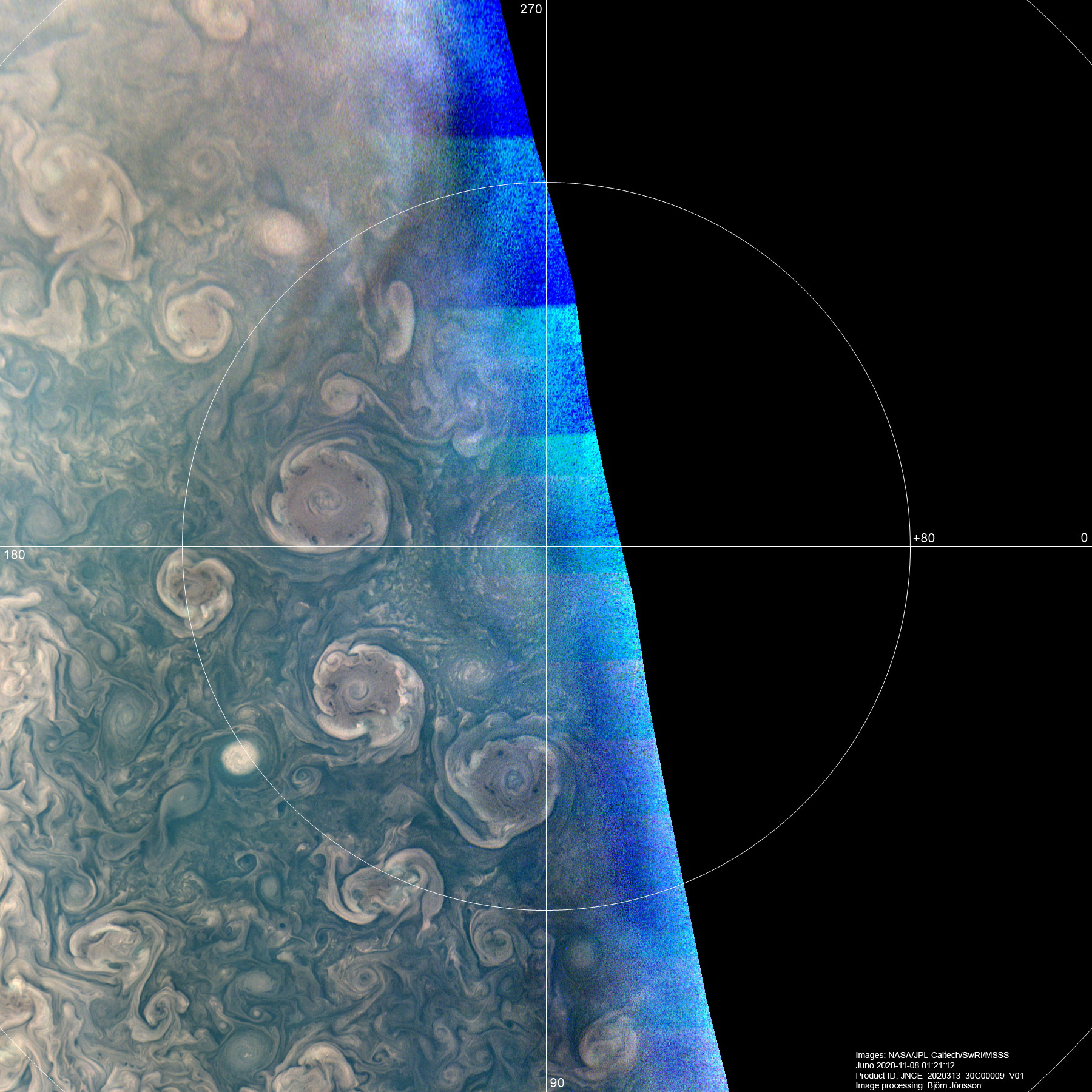 A north polar projection map showing the area around Jupiter's north pole. The map has been processed to better reveal faintly illuminated features near the terminator, including a part of the central North Polar Cyclone. The contrast was also increased and small scale details sharpened. The area near the terminator above and a bit left of the central North Polar Cyclone looks especially interesting in this image. Latitudes are planetographic.