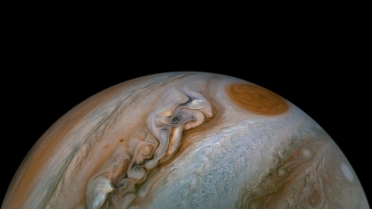 Processed using the JunoCam imager's PJ31 South Temperate Belt raw images and data from NASA's Juno spacecraft flyby on December 30, 2020. Enhanced to highlight features, clouds, colours, and the beauty of Jupiter. Artist's impression - not representative of true colour.