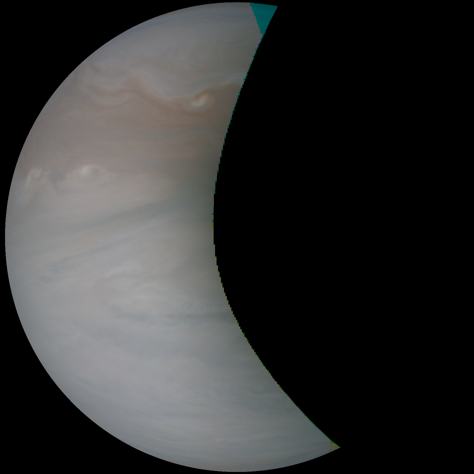 Junocam pixels are 12 bits deep from the camera but are converted to 8 bits inside the instrument using a lossless "companding" table, a process similar to gamma correction, to reduce their size. All Junocam products on the missionjuno website are in this 8-bit form as received on Earth. Scientific users interested in radiometric analysis should use the "RDR" data products archived with the Planetary Data System, which have been converted back to a linear 12-bit scale.