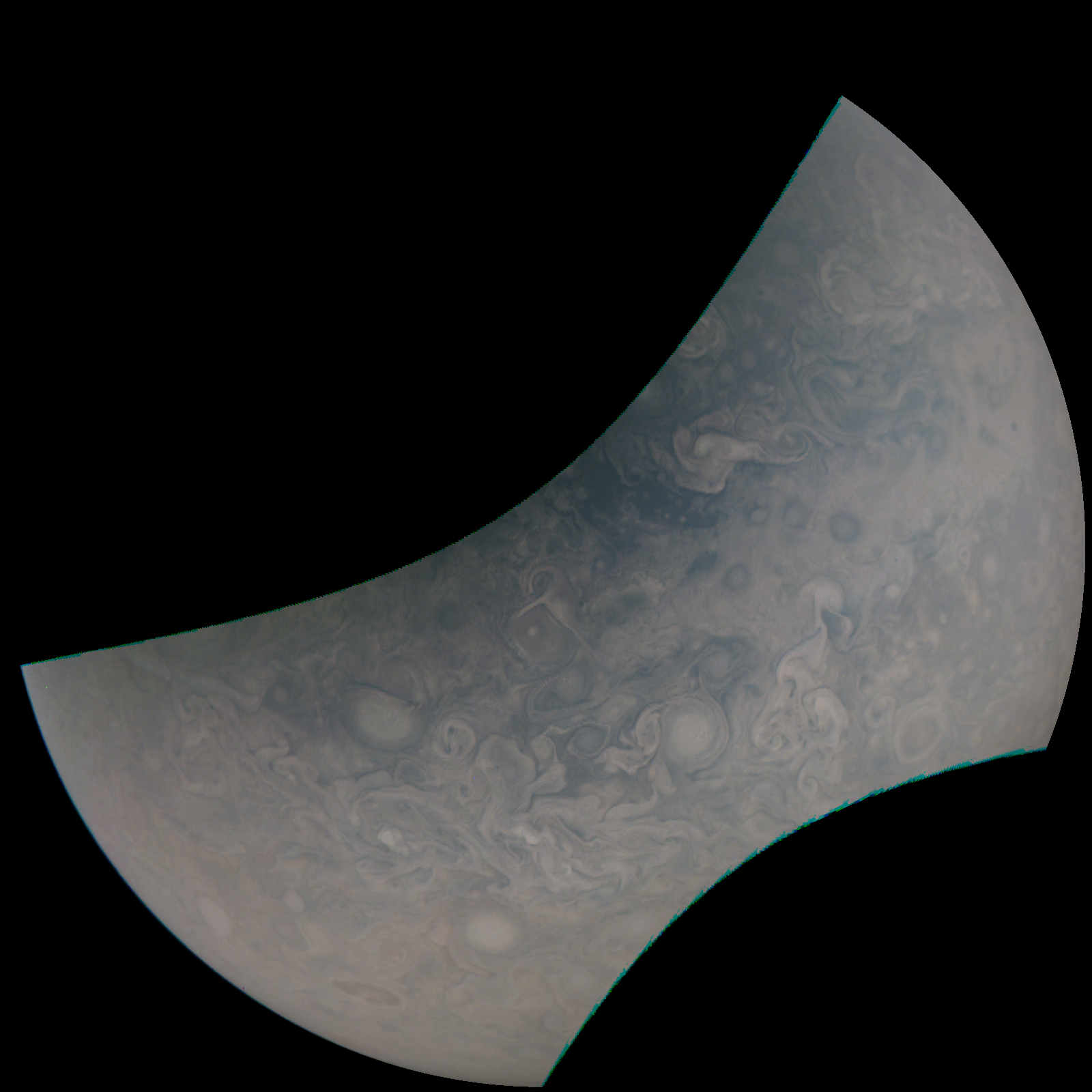 Junocam pixels are 12 bits deep from the camera but are converted to 8 bits inside the instrument using a lossless "companding" table, a process similar to gamma correction, to reduce their size. All Junocam products on the missionjuno website are in this 8-bit form as received on Earth. Scientific users interested in radiometric analysis should use the "RDR" data products archived with the Planetary Data System, which have been converted back to a linear 12-bit scale.