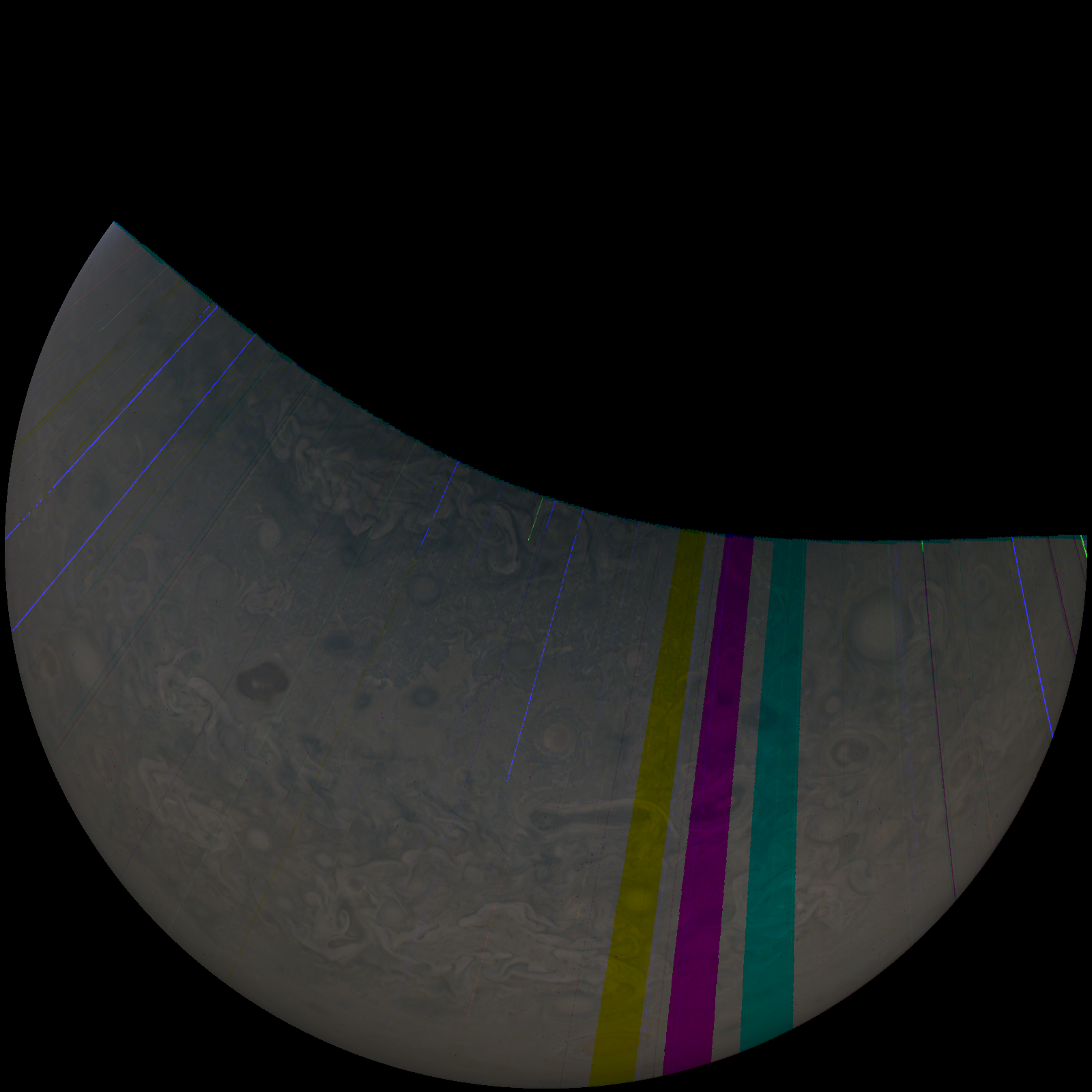 Junocam pixels are 12 bits deep from the camera but are converted to 8 bits inside the instrument using a lossless "companding" table, a process similar to gamma correction, to reduce their size. All Junocam products on the missionjuno website are in this 8-bit form as received on Earth. Scientific users interested in radiometric analysis should use the "RDR" data products archived with the Planetary Data System, which have been converted back to a linear 12-bit scale.
