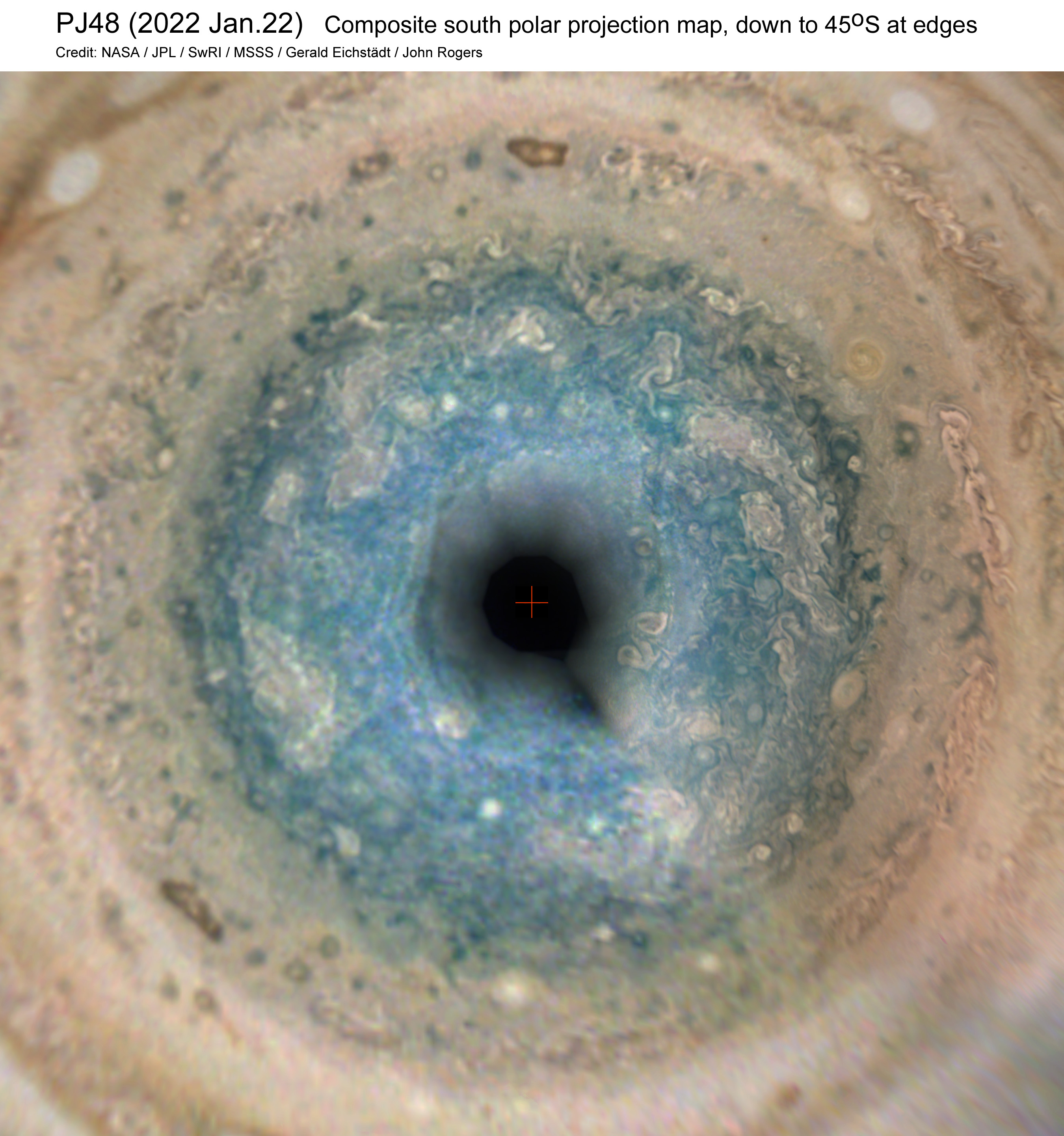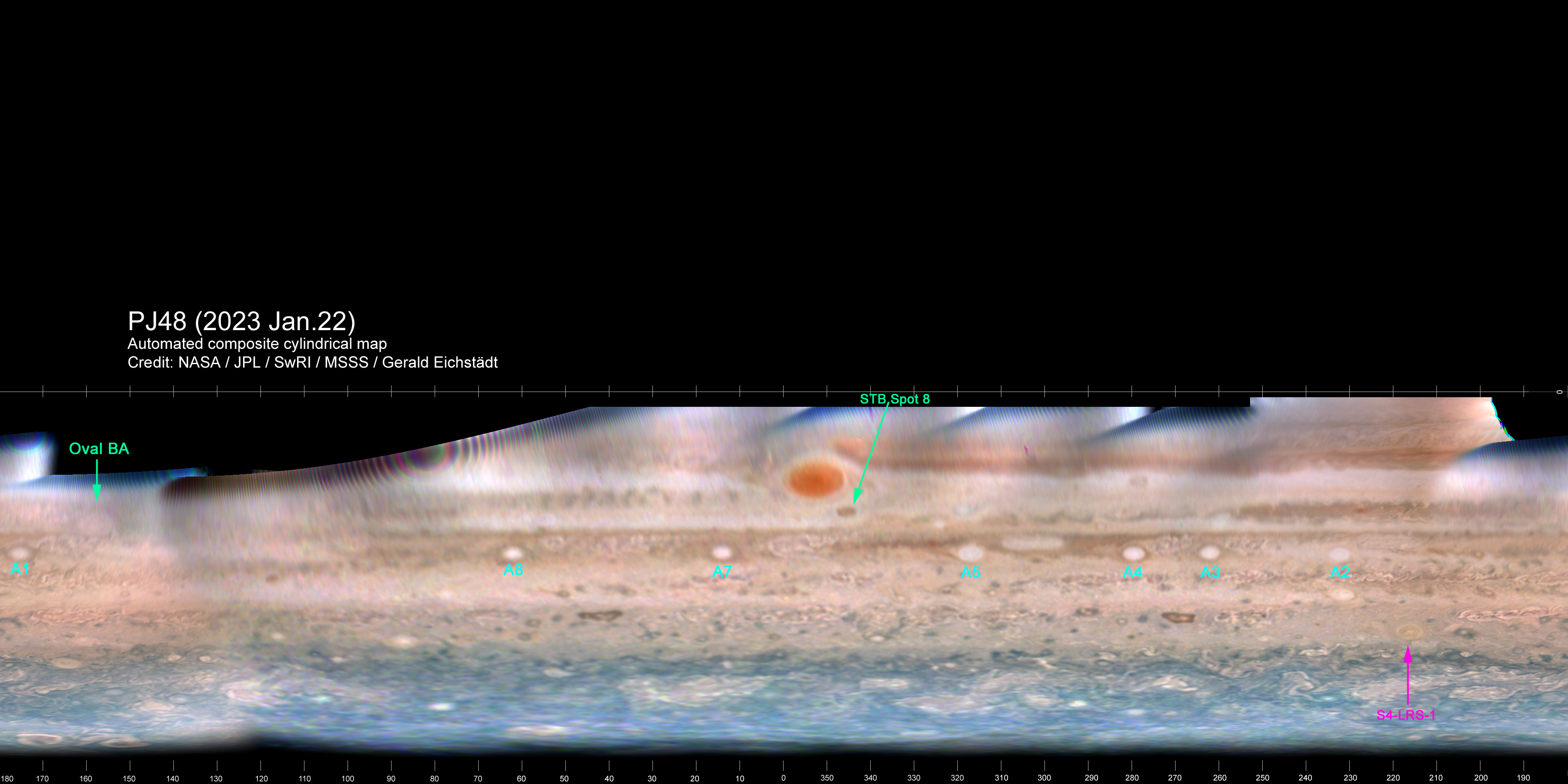 Although most of the PJ48 images were lost due to an apparent overheating issue, JunoCam returned to normal operation when the spacecraft was ascending over the southern temperate regions, so Gerald Eichstädt has produced global cylindrical maps and south polar projection maps as usual, covering the high southern latitudes in RGB and CH4. So I have prepared a brief report (attached here); Figures 1 & 2 present the RGB maps (to be attached in subsequent Comments). They confirm the continued existence of some ovals that are now hard to resolve in late-apparition ground-based images (e.g. S2-AWO-A2 and S4-LRS-1), and they continue JunoCam’s coverage of the south polar region. --John Rogers.