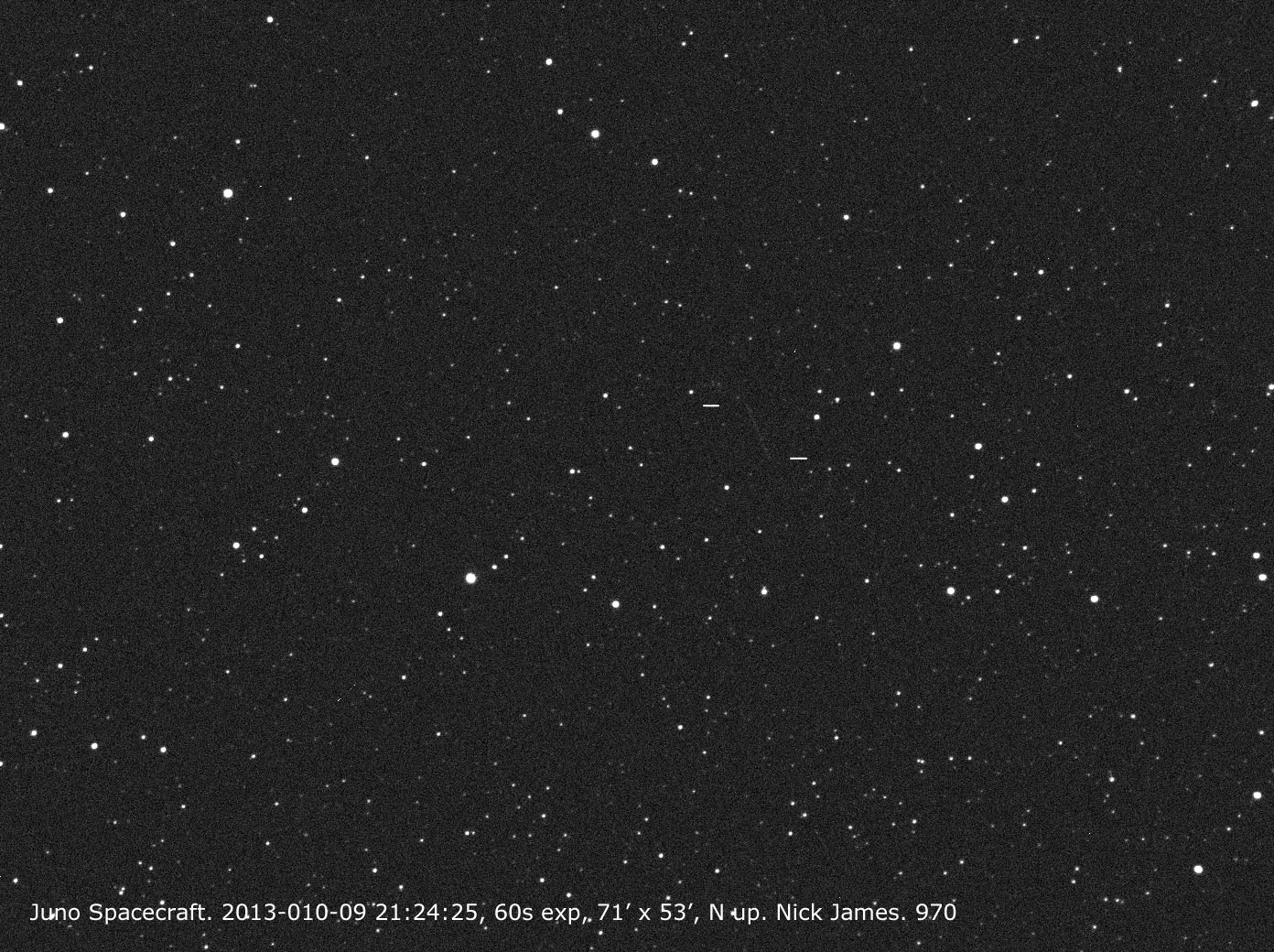 A couple of hours after Juno passed by Earth on Oct. 9, 2013, British observer Nick James used an 11-inch Schmidt-Cassegrain telescope to obtain this sequence of five-second exposures, showing the spacecraft moving against the background stars.