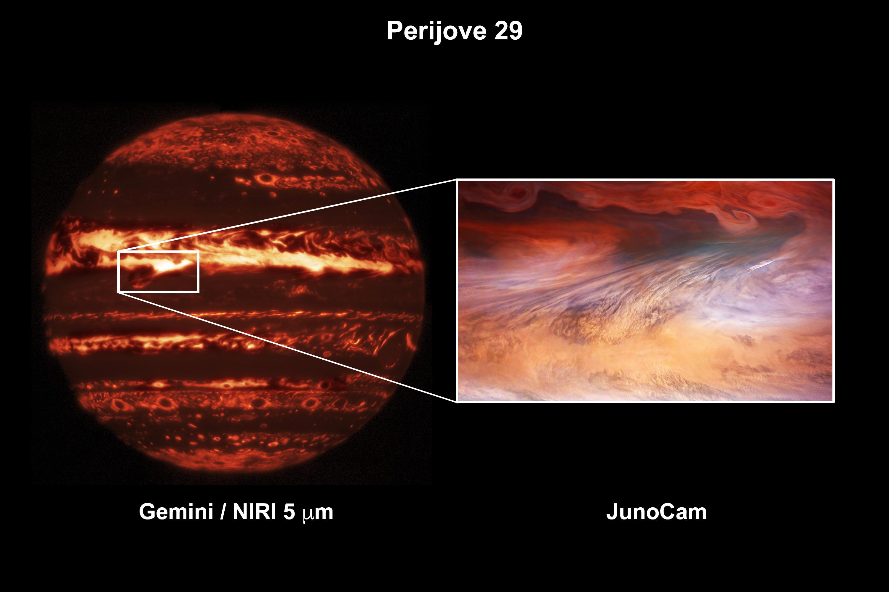 Citizen scientist Brian Swift processed the images to enhance the color and contrast, with further processing by Tom Momary to map the JunoCam image to the Gemini data.