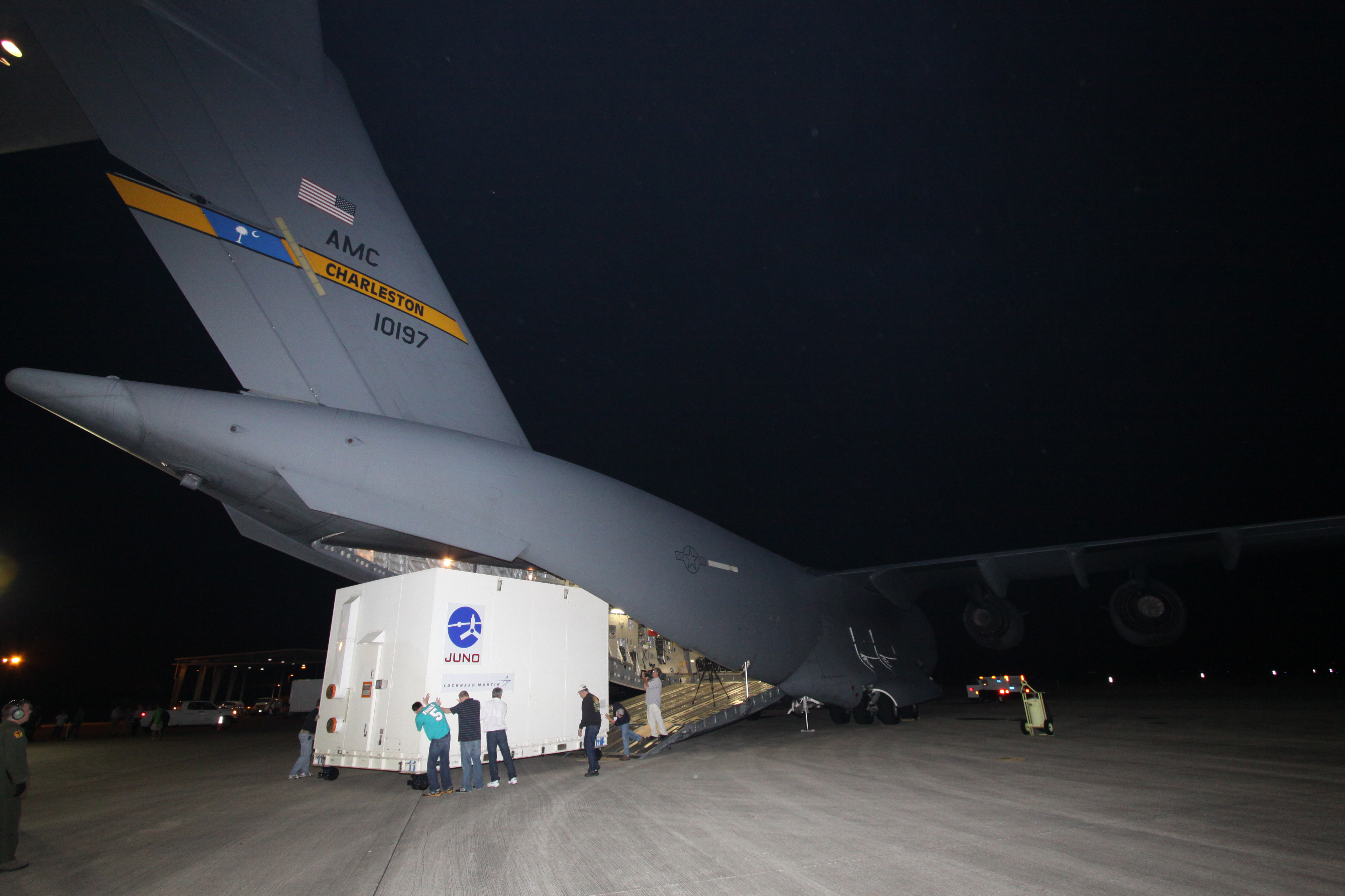 In the evening hours of April 8, NASA's Juno spacecraft arrived in Florida to begin final preparations for a launch this summer. The Jupiter-bound spacecraft made the trip from Denver inside the belly of a U.S. Air Force C-17 Globemaster.