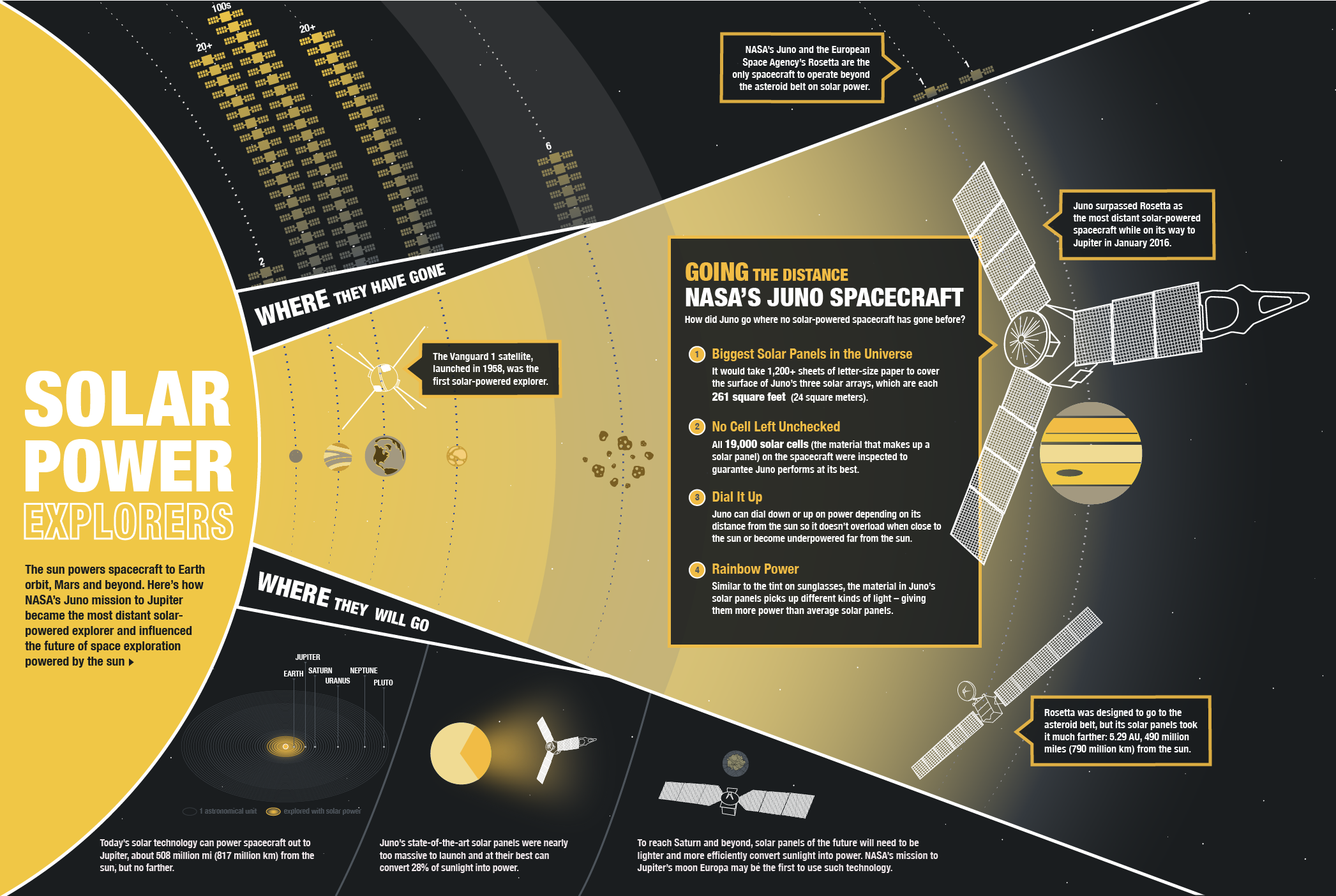 in 2011, Juno is the first solar-powered spacecraft designed to operate at such