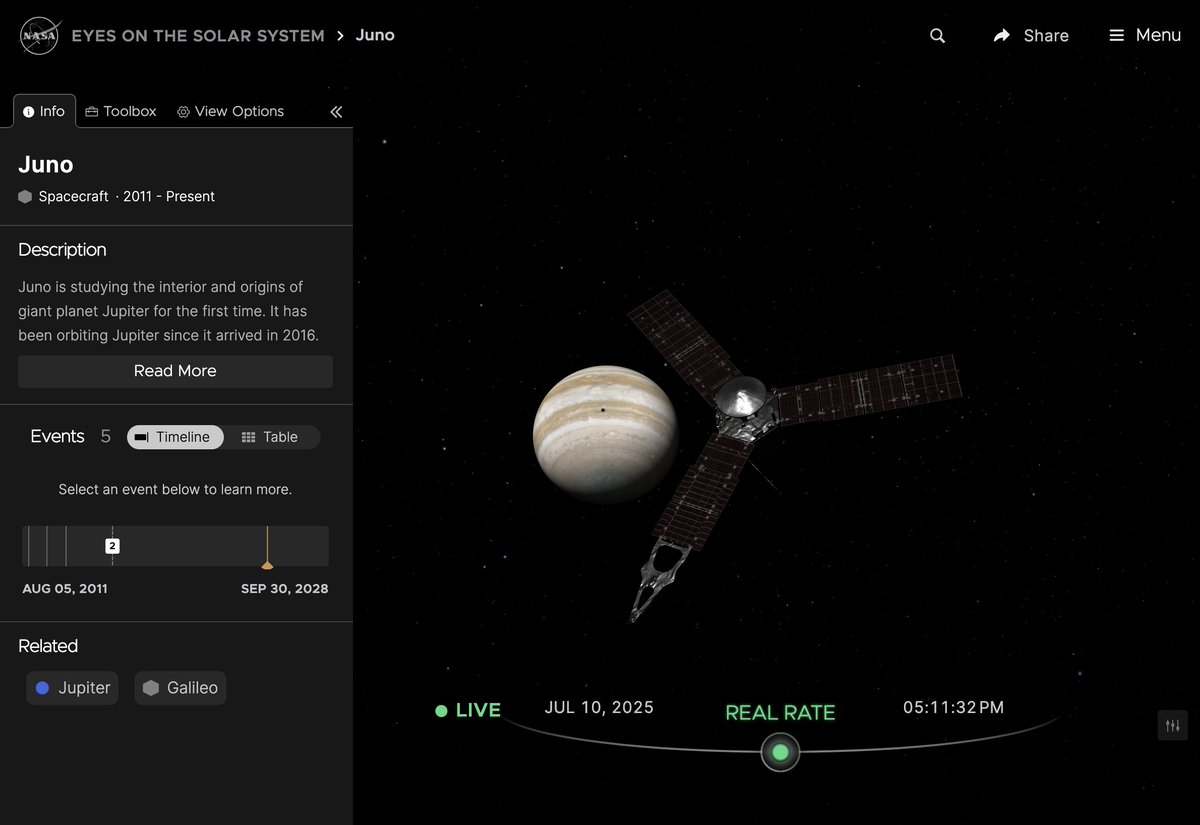 A simulated view showing the position of NASA’s #JunoMission as it closed in on Jupiter for its 74th flyby of the giant planet.